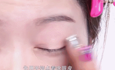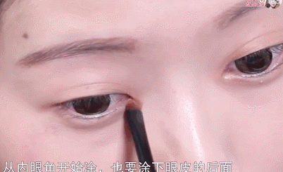 先用哑光感米色眼影在上眼皮大面积晕染开来,为了好上色,下眼睑后三分之一处,也同样要用米色稍稍做打底~