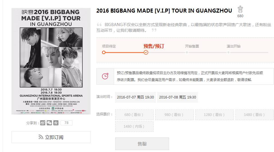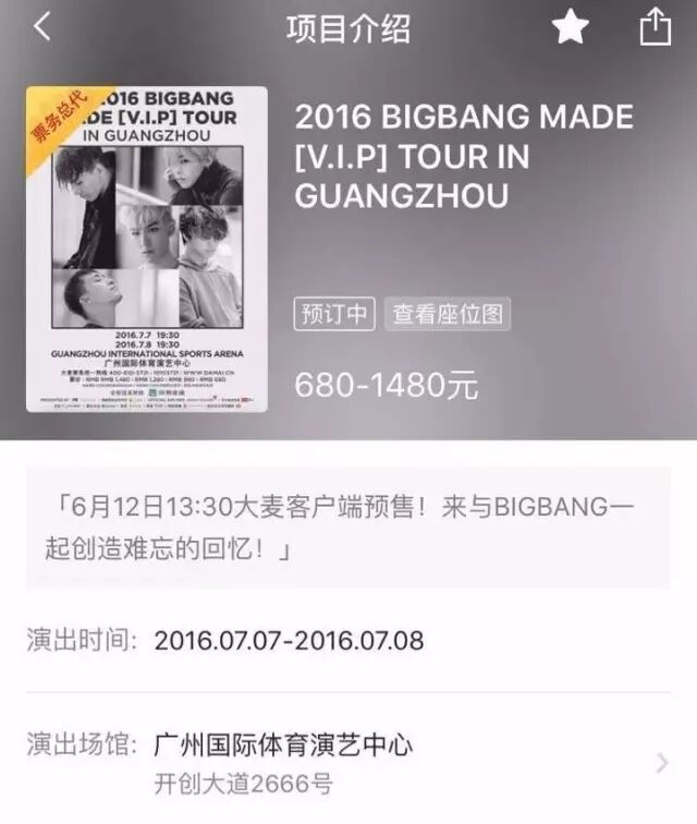 Bigbang三巡广州站在昨天下午一点半开始预售,小伙伴们你们抢到票了没?