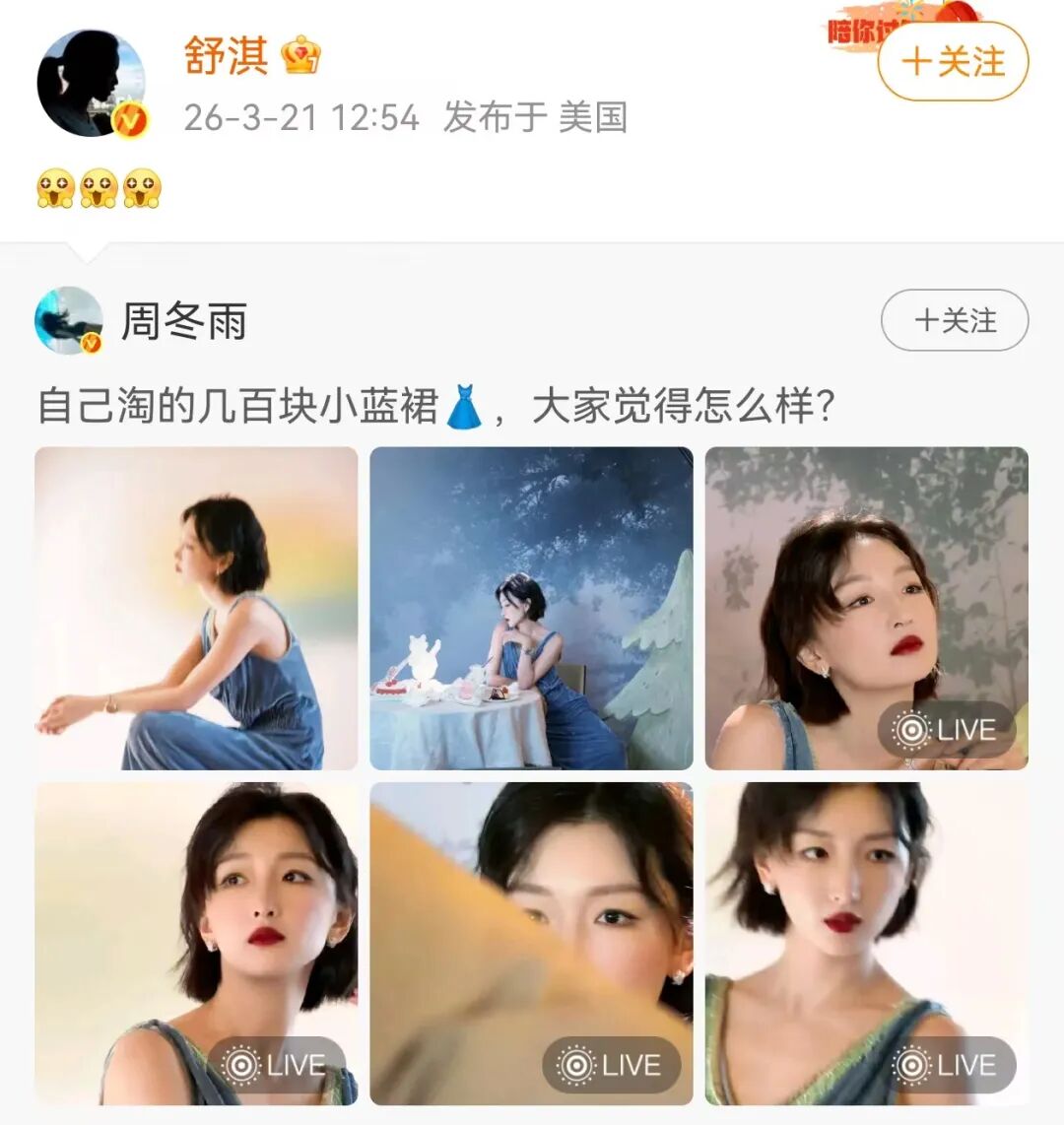 周冬雨走红毯穿几百块自淘小蓝裙,舒淇连发星星眼点赞,相约一起淘货 钱江晚报 内地女星 2026-03-22 13:42:48 20 创作不易,用心坚持,欢迎请BaGua喝几杯爱心咖啡!打赏并支持本文 打赏并删除本文 3月21日,“周冬雨穿自己淘的裙子走红毯”,冲上热搜。当天,演员舒淇转发了周冬雨身穿蓝裙的照片,并配上三个满眼期待的星星眼表情。之后,周冬雨在其评论区回复:“下次和姐姐一起淘货。”此前,周冬雨曾在社交平台问网友:“自己淘的几百块小蓝群,大家觉得怎么样? ”原来,她此次走红毯穿的裙子,既不是品牌方赞助,也不是租借,而是自己淘的平价私服。潮新闻·钱江晚报记者综合责任编辑:袁颖 创作不易,用心坚持,欢迎请BaGua喝几杯爱心咖啡!打赏并支持本文 打赏并删除本文 感谢您的支持鼓励,我会继续努力的!文章地址:用户邮箱:打赏金额:USDT 请输入数字点击”去打赏“,即可进行打赏支持本文章哦 周冬雨 发表评论