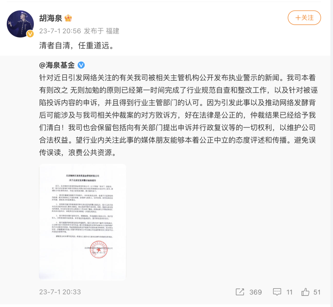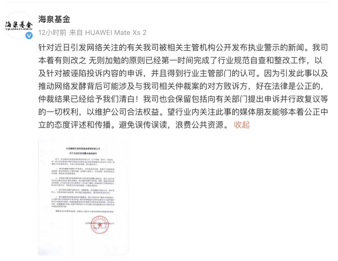 海泉基金微博7月1日回应称,针对近日引发网络关注的有关我司被相关主管机构公开发布执业警示的新闻。我司本着有则改之无则加勉的原则已经第一时间完成了行业规范自查和整改工作,以及针对被诬陷投诉内容的申诉,并且得到行业主管部门的认可。因为引发此事以及推动网络发酵背后可能涉及与我司相关仲裁案的对方败诉方,好在法律是公正的,仲裁结果已经给予我们清白!我司也会保留包括向有关部门提出申诉并行政复议等的一切权利,以维护公司合法权益。望行业内关注此事的媒体朋友能够本着公正中立的态度评述和传播。避免误传误读,浪费公共资源。