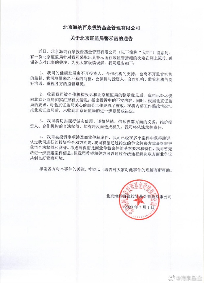 6月25日,北京证监局发布了对北京海纳百泉投资基金管理有限公司(以下简称“海泉基金”)采取出具警示函行政监管措施的决定。