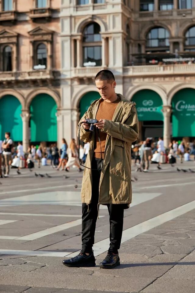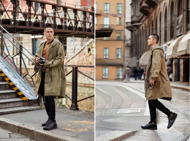 穿梭在米兰的大街小巷,用镜头捕捉城市的美好。夫仔身着军绿色风衣,搭配简单帅气的 HOGAN R261 复古跑鞋,完美演绎意式奢潮风格。