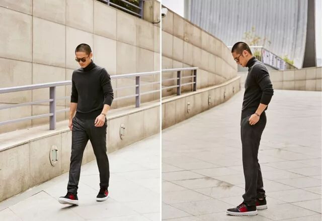 红与黑,低调而又不凡的颜色搭配。夫仔脚上的这双 HOGAN H341 坦克底运动鞋完美 match 整个造型,演绎出充满都市风尚的活力潮男造型。