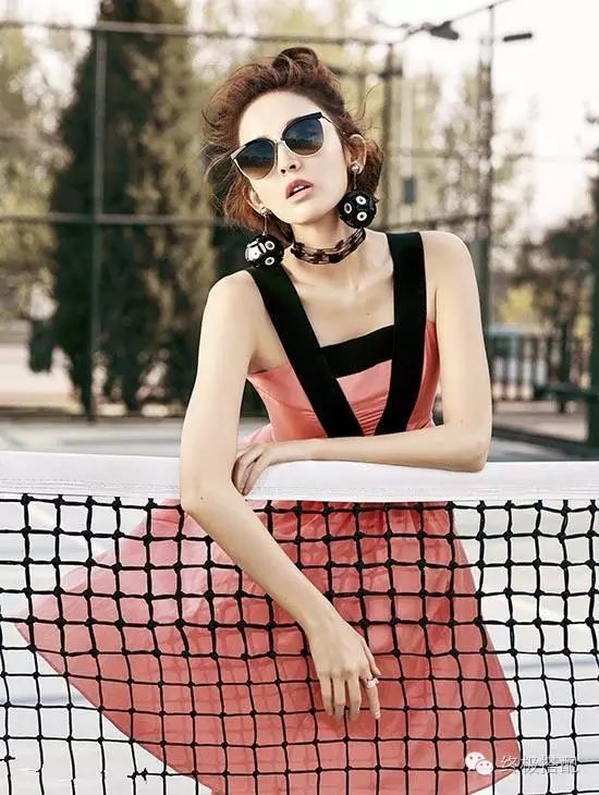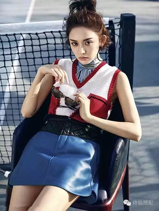 坐在网球场上得娜扎,看起来十分有范,深v无袖黑色上衣搭配黄色条纹半身裙,脚踩小白鞋,青春活力。