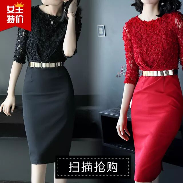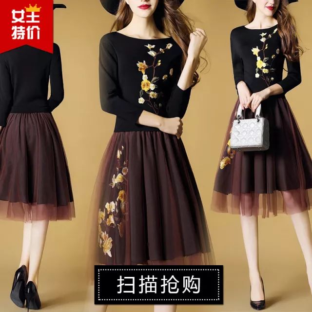 七分袖网纱拼接绣花连衣裙,收腰显瘦显身材