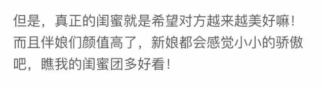 再说了,人家新娘都把她们请来当伴娘了,不就是为了好闺蜜们一起见证幸福嘛,哪会想这么多风光被抢的事呀!