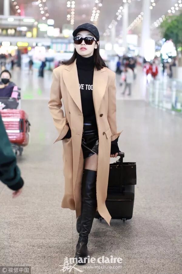 我们最会穿衣搭配的宋茜,则是选择了头戴Balenciaga黑色Logo印花鸭舌帽,戴黑色墨镜,身穿Loewe驼色毛边双排扣风衣,内搭Christian Dada黑色字母印花高领针织衫,手推Saint Laurent黑色手袋、行李箱,下穿RtA黑色拉链高腰皮裙,脚踩Fendi黑色平底过膝靴,没错,就是过膝长靴,在这样的季节里,过膝长靴也和大衣是绝对呢!