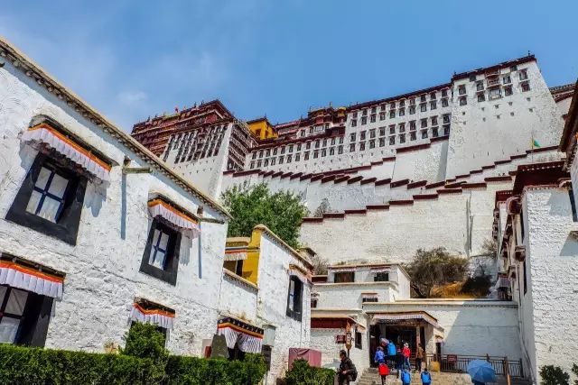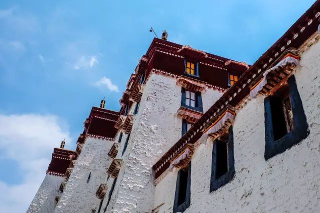 布达拉官的布局和佛像供物等与其他寺庙并无差别,为什么称之为“宫”而不是“寺”呢?因为布达拉宫建于吐蓍时期,那时西謦还不是政教合一的社会,布达拉宫只是作为王的宫殿而存在并无香火。但从五世达赖受顺治皇帝册封,成为西藏政教首脑之后,布达拉宫不仅是政权机关所在地,也是藏传佛教大活佛的居所,自然而然就成为顶礼膜拜、供奉香火的圣地了。布达拉还是观音胜地普陀洛迦的梵语译音,表示观音持航以普度众生。 这里是布达拉宫的最西边,过往称为札厦的僧人宿舍区。但见一些白石墙、黑窗框、红檉柳随意排列著,将已经带灰白的天,切割得边角纵横且势态均衡。