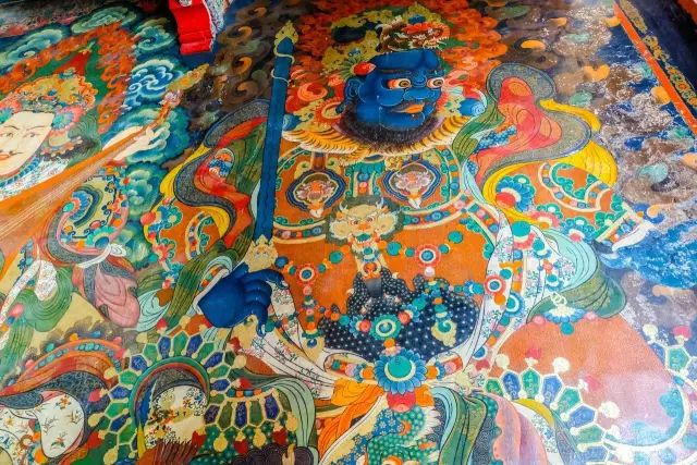 大殿四壁皆是西藏著名画师所绘五世达赖生平传记壁画,面积达280余平方米,记录五世达赖一生的事业和功绩。