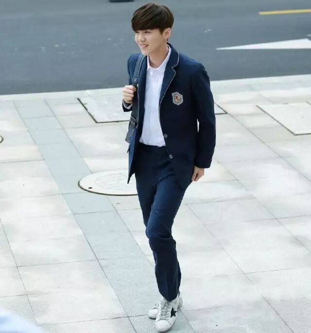 来看看一身学生制服的白衣鹿晗学长帅到没边!但小编不争鹿晗学长,他背的这款valentino超人标志真皮双肩包小编是想要啦!上学去......