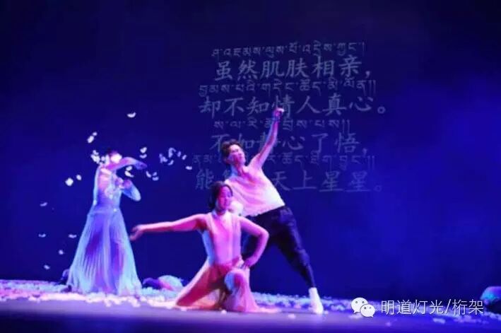 《爱情的证悟》分6个篇章,充分展示了仓央嘉措诗歌的优雅,将藏民族元素巧妙地融合到现代舞蹈中。明道灯光1500W切割灯闪耀全场,其快速流畅的切割,清晰艳丽的图案,使整场剧目流光溢彩、美轮美奂。