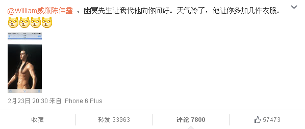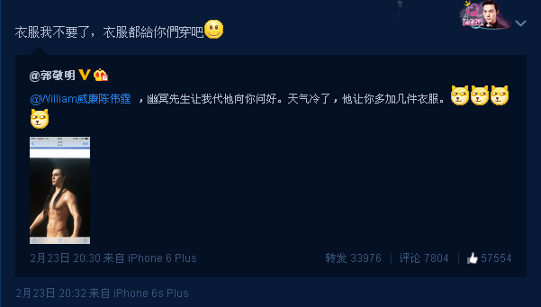 昨晚,郭敬明通过微博爆出一张陈伟霆的半身裸照,并称:“幽冥先生让我代他向你问好。天气冷了,他让你多加几件衣服。”