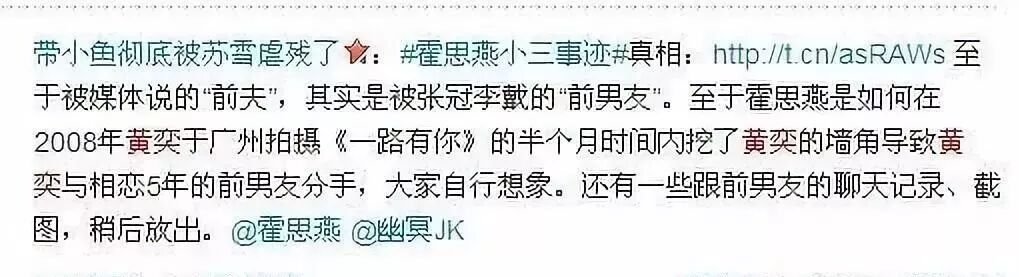 其实黄毅清在和黄奕结婚前就因为帮着黄奕撕霍思燕而出名,当年霍思燕在其微博中大骂某怨妇女星,希望她不要借前夫来炒作,还用其新片的一句台词讽刺该女星贪慕虚荣,撒谎愚蠢,随后更直接艾特黄奕,称黄奕雇水军黑她是小三,为此黄奕与霍思燕隔空互掐,从而也牵扯出了他们之间的另一个男人,杨溢。