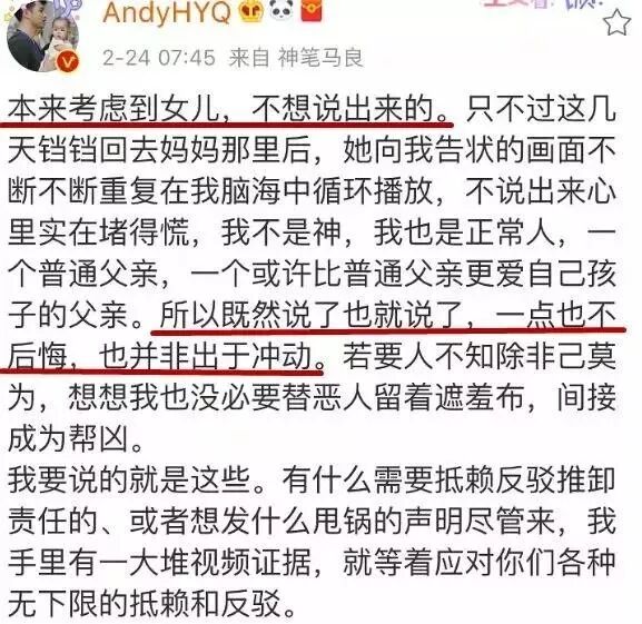 还没一天他又马上发表了道歉声明,道歉没多久又再次他又再次发文指责黄奕,自己为了女儿一定会离婚。他公开指责黄奕出轨,并手握偷情证据,揭露黄奕是虚伪“慈母”