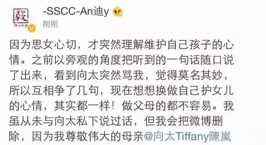 向太一发飙黄毅清立马撤退,说自己也是听别人说的,都是为人父母,还夸赞向太是位伟大母亲。