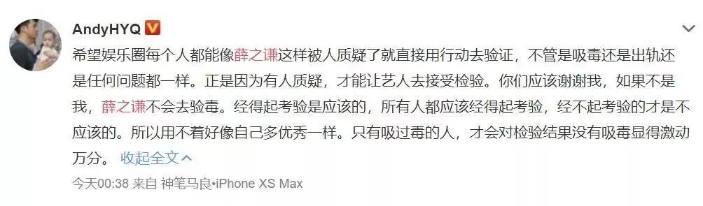 眼看形势如此,他又要求大家感谢他,理由是“正是因为有人质疑,才能让艺人去接受检验。你们应该谢谢我,如果不是我,薛之谦不会去验毒。