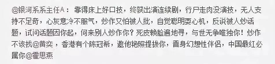 这个时候黄毅清毅然出场了,他在微博以一首打油诗攻击怒骂霍思燕没人气,没演技,耍心机,全靠得床上好口技上位。
