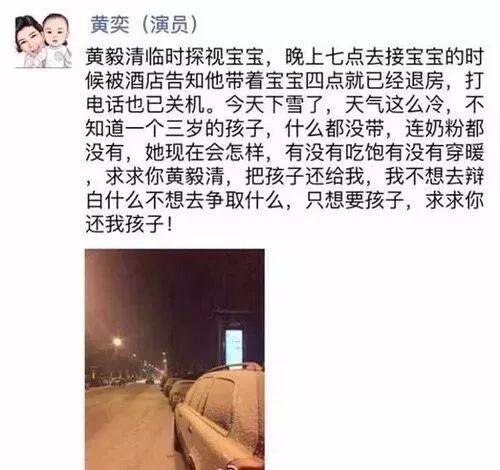 黄毅清趁着探视私自不知一声地把孩子抱走了,逼的黄奕发圈求他赶紧把孩子送回来,而黄毅清也在微博上开始了自己的表演,表示自己已出境人在美国。