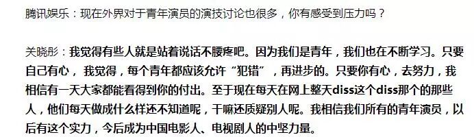 其中有一句话:“我很喜欢贴近生活,这对于演员是一件很重要的事情,至少没有浮在天上,浮在天上,老百姓是不会喜欢的,大家都喜欢接地气的。”