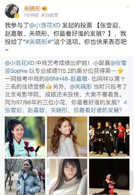去年艺考成绩出来之后,有人在微博上发起了一个投票说张雪迎、赵嘉敏和她更看好谁的发展,她把票投给了自己随后秒删。也是很直接啊。