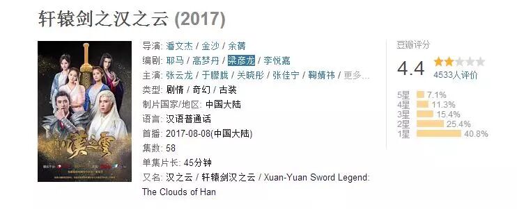 之后关晓彤出演了《轩辕剑之汉之云》,好像还是部玛丽苏的剧,豆瓣评分4.4。