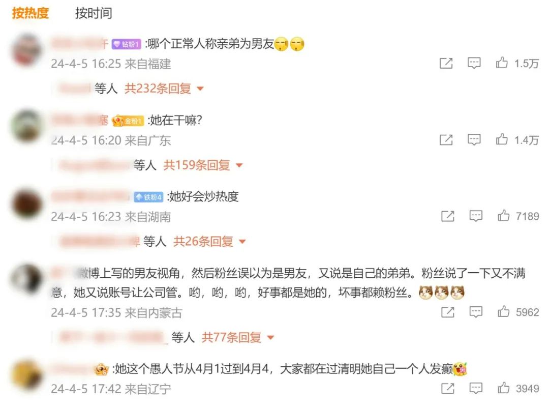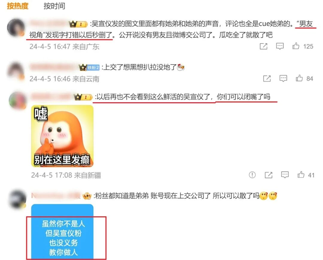 吴宣仪口碑再度翻车,竟把亲弟弟称为男友,事后还放话“少管我” 八卦先生 内地女星 2024-04-05 23:28:06 248 创作不易,用心坚持,欢迎请BaGua喝几杯爱心咖啡!打赏并支持本文 打赏并删除本文 愚人节当天,前火箭少女101成员吴宣仪发了一组无美颜滤镜的自拍照,表示要公布恋情,但后面毕竟带了“愚乐”的话题,所以也没什么人把她的话当真。敢发无滤镜照片的女爱豆少之又少,吴宣仪确实是有勇气、敢于做自己的,让大家知道原来明星化妆也会卡粉,减少焦虑。但她都这么勇敢发照片和开玩笑了,还是无人在意,不知道她是否心有不甘,所以几天后再次语出惊人。当愚人节已经过去,吴宣仪还在继续恋情的话题,发了一组在海南拍摄的照片,配文是“男友拍的直拍,以及他的碎碎念”。这下,不仅是敏感的粉丝,哪怕是吃瓜群众也会觉得她是在官宣恋情吧?等大家真这么想了,吴宣仪又表现出一副不懂大家为什么会误会的样子,澄清自己没有男朋友,所谓的男友是她弟弟,最后还用“少管我”三个字奉劝大家别乱说话,言语间似乎颇为生气和无语。看样子,吴宣仪只是想开个玩笑(应该是吧?),但粉丝一开始没get到,于是双方产生了误会,结局是吴宣仪气得要把账号归还公司打理。本来吴宣仪开的玩笑是无人在意的,但后续的回应经过大V们的传播总算小小出圈了,引起了路人的讨论。大部分网友都觉得吴宣仪言行奇怪,怀疑她是不是想炒热度,毕竟谁会把弟弟称呼为“男友”?没想到引起路人注意之后,轮到粉丝生气了,他们一边解释粉丝都知道那是弟弟,一边又说吴宣仪打错字了,把“男友视角”打成了“男友”,甚至还有粉丝骂“外人”多管闲事,害得他们失去了鲜活的吴宣仪。整个事件围观下来,八先生简直满脑子都是问号。吴宣仪刻意整出个误会,还让粉丝少管她,这已经够离谱的了。当事情引起路人热议,粉丝又骂外人多管闲事。合着吴宣仪最无辜了?粉丝爱偶像心切可以理解,但错漏百出的解释实在没法帮吴宣仪洗白,因为她的原句是“男友拍的直拍,以及他的碎碎念”,上半句和下半句的重点都男友,如果改成“男友视角拍的直拍”,后面又凭空冒出一个“他”,这到底想让别人误会还是不想?粉丝倒不如帮她解释“她只是开个玩笑”更好。其实吴宣仪也不是第一天说话含糊不清了,此前她言语之夸张,在内娱的爱豆界可谓数一数二。吴宣仪最著名的言论,当属一天喝多少杯奶茶的话题。2018年,她参加选秀时接受采访,表示自己很爱喝奶茶,一天可以喝四杯甚至更多。2019年,当她已经成功从选秀节目中出道,上综艺时回答同样的问题,一天喝奶茶的最高记录具体到了八杯。正常人一天喝四到八杯奶茶且持续一年的话,身体早就出问题了,还能轻松上节目侃侃而谈吗?她这番奶茶言论被网友吐槽之后,上别的真人秀时又试图给自己爱喝奶茶的人设增加一个合理的理由——贫血。然而这样的解释反倒给人一种无知的感觉,都贫血了还不好好调理身体,反而喝不健康的饮料,这是什么脑回路?吴宣仪自曝一天喝八杯奶茶的那一年(2019年),上了何炅的节目,再次自曝有一次跟李子璇两个人一晚上吃了七桶泡面,注意不是白天,也不是一小碗,而是“晚上”和“桶”。按她喝奶茶的量来估计,她至少吃了三桶半吧?但也许是吴宣仪记错了,因为她2018年接受采访的时候,明明说的是八桶。也不知道几年后再次回忆起吃泡面,会变成几桶呢?在吃的方面夸张一下,顶多算想立身形苗条的吃货人设,但有些话说浮夸了,就会显得滑稽了。比如4年前,在一档记录明星考驾照的真人秀里,武艺谈到了他从前被撞的经历,那时候他坐在副驾驶被一辆车追尾,让他印象深刻。吴宣仪听完之后表示自己在六、七岁的时候也被撞过,用词还特别浮夸——撞飞,因为对方车辆的速度特别快。如果孩童时期真被撞飞了,应该伤得挺重的吧?用撞飞来形容还不够,吴宣仪补充道:“飞了五六米”。听到这个数字,耿直的武艺忍不住问她为什么现在看起来一点事都没有,可以说是观众的嘴替了,只可惜她并没有回答,只是笑笑略过。有段时间,吴宣仪的穿着打扮被吐槽土气满满,全身大牌却穿出了精神小妹的感觉。本来大家吐槽完,事情也就过去了,但吴宣仪就是气不过,不仅上综艺的时候回应了,说别人越是吐槽她土,她就越是要乱穿。等到综艺播出,她还发了四张身着露腰装的自拍照,并配文“这个圈子女孩不被善待”。明星的穿着打扮被讨论真的太正常不过了,她居然能上升到整个圈子的女孩,是希望大家对她口下留情吗?可是圈内人已经过得很滋润了,还想怎么样?当时她的发言引起了很多人的不满,口碑一度翻车。只不过公众忘性比较大,很快就没人记得她的言论了。如今的吴宣仪,虽然资源降级没能演电视剧主角,但还是能演个女二、女三。前段时间她刚杀青了一部剧,是卢昱晓和王星越主演的古装剧,演技被于正夸上了天。以往她的演技是五官乱飞的水平,如今突变成“无法估量”,被圈内大咖夸上天,怎么不算被善待了呢?这种业务水平要是放到别的行业,早就混不下去了。吴宣仪要是真想做内娱活人,就应该加强一下心理承受力,别那么玻璃心。如果只是想通过“发疯”来炒热度,建议先有个代表作,不然无异于饮鸩止血。 创作不易,用心坚持,欢迎请BaGua喝几杯爱心咖啡!打赏并支持本文 打赏并删除本文 感谢您的支持鼓励,我会继续努力的!文