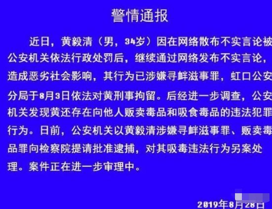 今天,上海市虹口警方正式发布通报,以寻衅滋事以及贩卖毒品罪对黄毅清进行申请批捕,一时间也是引来了不少人的围观了。这到底是什么情况呢?