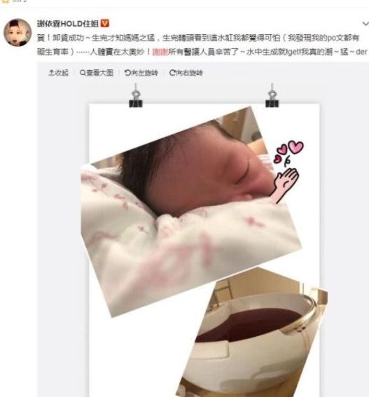 4日,谢依霖发文宣布生女喜讯,“卸货成功~生完才知妈妈之猛,生完转头看到这水缸我都觉得可怕⋯⋯人体实在太奥妙!谢谢所有医护人员辛苦了~水中生成就!get!”她还晒出了宝宝的半张脸,样子超萌!据悉,谢依霖2018年3月结婚,5月13日宣布怀孕,恭喜!