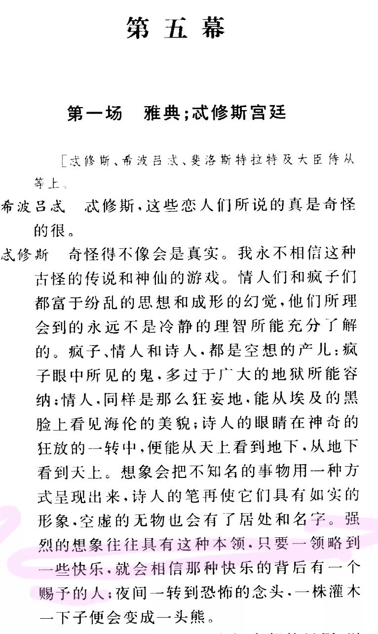 翻译:情人们和疯子们都富于纷乱的思想和成形的幻觉,他们所理解到的永远不是冷静的理智所能充分了解的。(朱生豪)