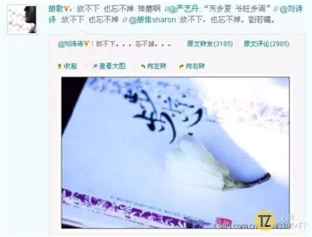 胡歌转发,同样表达自己放不下忘不了,虽然有可能是开玩笑,但很明显是三角恋关系,不过只是事已至此,胡歌也只能说刘诗诗可能更需要吴奇隆吧。