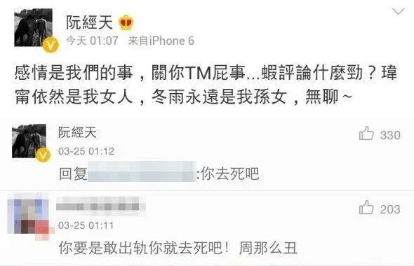 阮经天则半夜在微博回应,“玮甯依然是我女人”,还冲动怒骂网友去死。