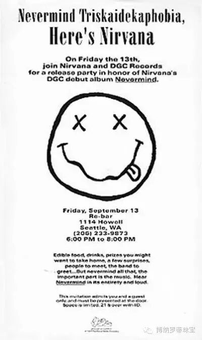 而涅槃乐队(NIRVANA)的经典笑脸logo也是从Smiley演变而来的呢~由科特本人随手涂鸦的这个笑脸,第一次出现在这个传单上,这个传单的制作是为了涅盘乐队于发行《Nevermind》专辑所举办的发行派队,《Nevermind》于1991年9月13日发行。
