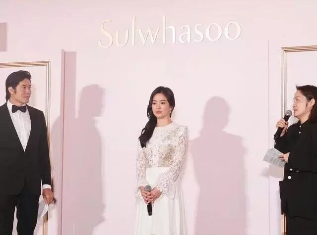 基本上就是在走神发呆了,活动现场的两个主持人一边介绍产品一边念台词,站在中间的宋慧乔却频频走神,看着就是有心事啊。