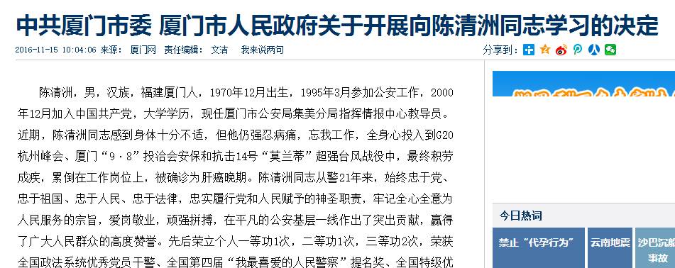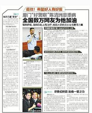 去年10月24日,厦门市委常委会专题研究确定了陈清洲同志为厦门市重大先进典型,并以市委市政府名义作出了关于开展向陈清洲同志学习的决定,号召全市广大干部群众向陈清洲同志学习。11月14日,市委宣传部牵头召开了“厦门市学习宣传陈清洲同志先进事迹新闻发布会”,邀请省驻厦媒体、市属媒体及网络媒体等对陈清洲同志先进事迹进行集中采访报道,把陈清洲重大先进典型选树工作推向一个新阶段。11月14日和15日,组织厦门电视台、厦门日报分别刊播了厦门市委市政府《关于开展向陈清洲同志学习的决定》,号召全市广大干部群众向陈清洲同志学习。11月15日至17日,我们组织了市属媒体集中采访活动,先后深入集美灌口交警中队、灌口派出所、灌口李林小学、集美公安分局、集美各高校、灌口镇街镇、社区、学校、陈清洲家中等,对陈清洲的同事、家人、学生、村民、救助过的当事人等进行采访,面对面了解掌握第一手资料,深入挖掘陈清洲同志的先进事迹。各新闻媒体纷纷组织系列专题报道和开辟专栏,在各重要版面、重要时段刊播刊登陈清洲同志先进事迹,在全市营造学习宣传陈清洲同志先进事迹的浓厚氛围。12月14日至15日,我们按照中宣部通知要求,又组织了中央电视台《新闻联播》和《焦点访谈》栏目、中央人民广播电台、人民日报、新华社、法制日报、光明日报、经济日报、人民公安报,以及人民网、腾讯网、新浪网、长安剑、“警事图说”等中央级媒体和公安自媒体,福建日报、福建广播影视集团、福建法治报、东南网等省级媒体,以及厦门日报、厦门电视台组成的媒体采访团,实地参观了陈清洲工作过的灌口交警中队等单位,采访了他的同事、家属和村委会干部、群众代表,以及高校保卫处领导、学生代表,并与群众与民警代表座谈,深入了解陈清洲推动灌口“亮灯工程”建设、开展交通安全教育、反诈骗宣传、微博帮寻人、抗击“莫兰蒂”台风等方面的先进事迹。在集中采访活动中,记者们被陈清洲的事迹深深感动,一致表示采访的过程也是自己深入学习“清洲精神”的过程。从人民公安报、厦门日报、厦门晚报、海西晨报、海峡导报等新闻报道稿件库中检索、筛选历年来有关陈清洲的新闻报道,把陈清洲的事迹材料、各级领导批示、典型新闻报道、工作照片、微博截图进行分类整理,从新浪厦门的大数据库检索出“@交警陈清洲”微博中有关帮助寻找走失人员的典型事例,编成《陈清洲事迹汇编——大爱无疆点亮“心灯”》《 陈清洲故事素材汇编》《@交警陈清洲微博寻人数据图册》等丰富的新闻报道素材。