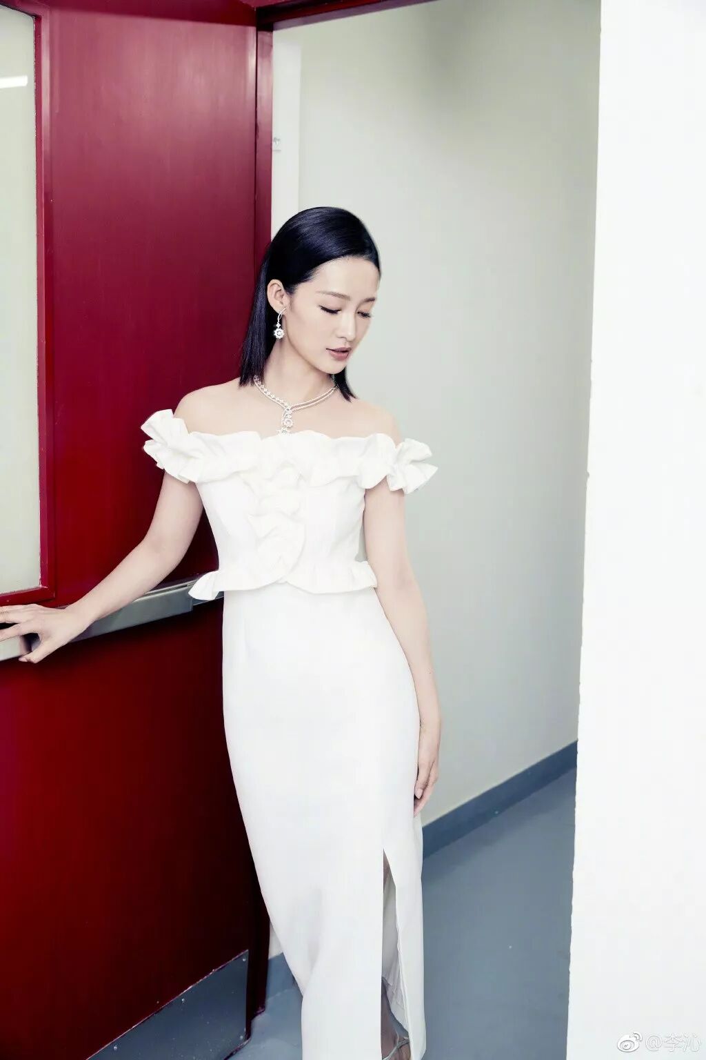 ▲白色露肩开衩长裙清新迷人,搭配简单的侧分直发就足够优雅。
