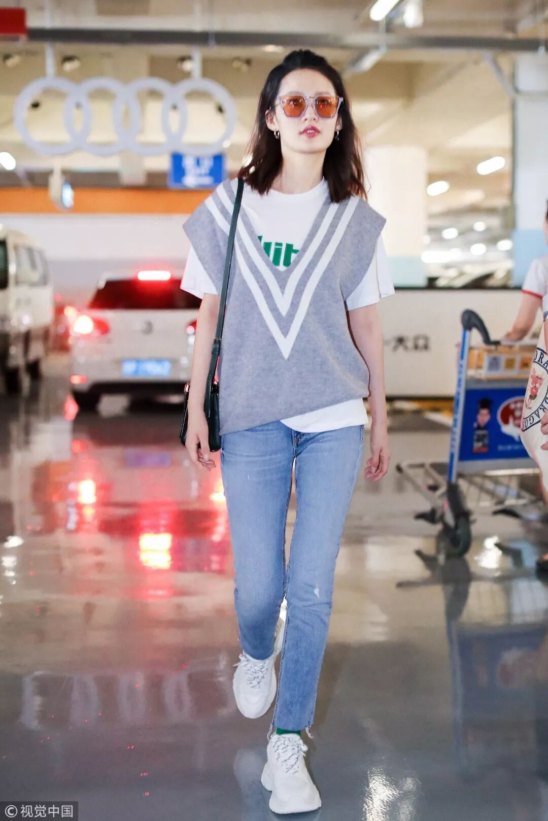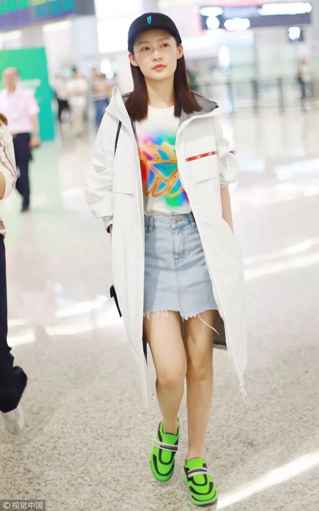 ▲虽然初秋来了,白T+牛仔半裙的两件套倒是也别急着收进衣柜,像李沁这样披上一件外套就是很应季的搭配,一双亮色运动鞋也增加了不少活力。