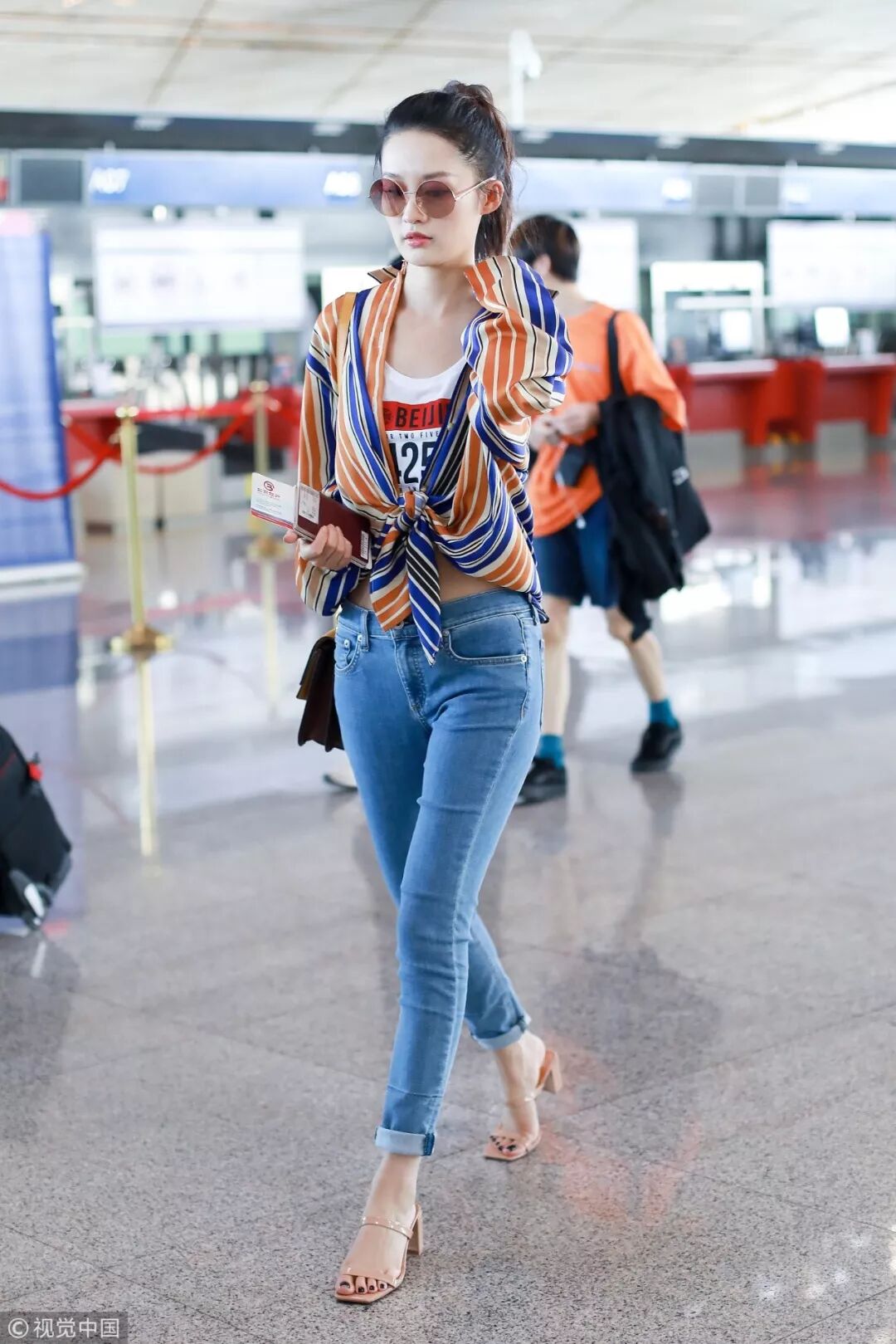 ▲白色背心搭配撞色条纹衬衫的组合就活泼了不少,把衬衫随意地打个结既能拉高腰线,还显得很随性。
