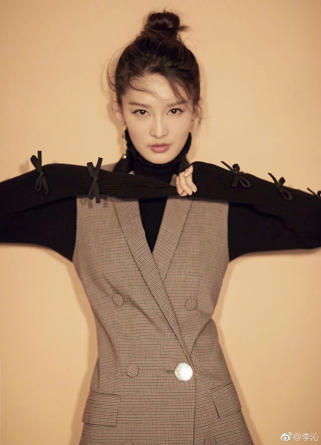 ▲西装马甲带着西装干练的属性,而内搭的黑色衬衫领口的花边设计和袖子上的一排小蝴蝶结就弱化了不少西装的硬朗,让李沁看起来又酷又甜。