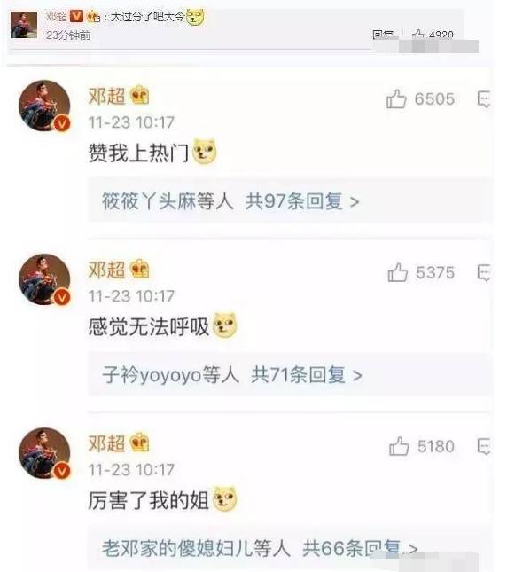 邓超平日里在电视荧屏上形象还是蛮帅的,没想到现实生活中居然这么逗逼,最主要的是他还娶了一个人不可貌相的黑粉老婆。厉害了我的超超!虽然是互黑,可是我们看到的还是满屏的恩爱啊,真的不打算考虑一下我们这些单身汪的感受吗,对于网友们的评论,我也差点笑出声来!