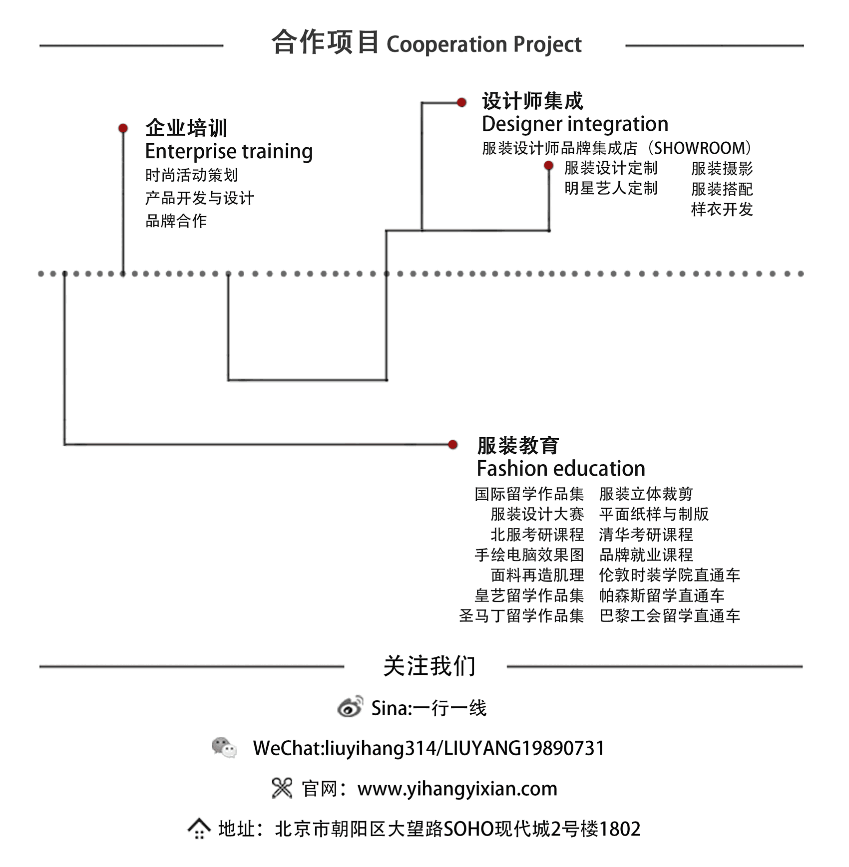 一行一线(YIHANGYIXIAN)国际服装设计教育工作室注册于北京,是由英国由中央圣马丁伦敦时装学院,皇家艺术学院,美国帕森斯设计学院法国巴黎工会,等名校设计设计师,独立明星实战设计师等艺术家团队所组建的工作室,工作室成立于2012年,开始做服装大赛培训,开展服装立体裁剪和服装平面制版的课程教育,2013年成立创意服装设计教研室,以挖掘学生创作天赋,将国际最有创意的设计课程资源整合辅导学生专业技能2014年服装留学课程-2015年团队不断壮大,在中国艺术圣地-798艺术区,开设了服装设计程序、手绘、服装大赛面料设计、服装裁剪与工艺课程,同样承接明星服装品牌高级定制业务设计研发项目,2015年开设了北京CBD商圈国贸校区,中国最繁华的经济中心,2015年向服装企业和国际院校,品牌输送了大量高端人才,2016近期教育捷报成绩不断,不乏学生留学深造,留学方面学员获得了皇家艺术学院服装设计系MA offer ,帕森斯设计学院MA offer ,申请率不断高升,培养学生参赛获得顶级赛事24届汉帛杯金奖,在业界建立了良好的口碑国外院校认可和重视,被誉名为-中国服装高级人才培养摇篮-中国服装设计新概念研究所-中国服装大赛指导中心等名誉。2017年由国际师资力量在此加盟成立一行一线YIHANGYIXIAN Fashion Education。
