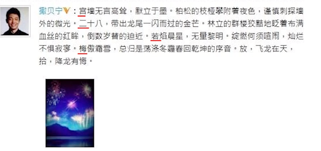 在章子怡因为电影《一代宗师》出席柏林电影节的时候,撒贝宁还特意在微博上写了一首藏头诗——“宫二若梅,柏林绽放”送给女友。