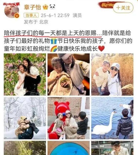 时间又往前推,今年六一,章子怡晒出一双儿女的合影。