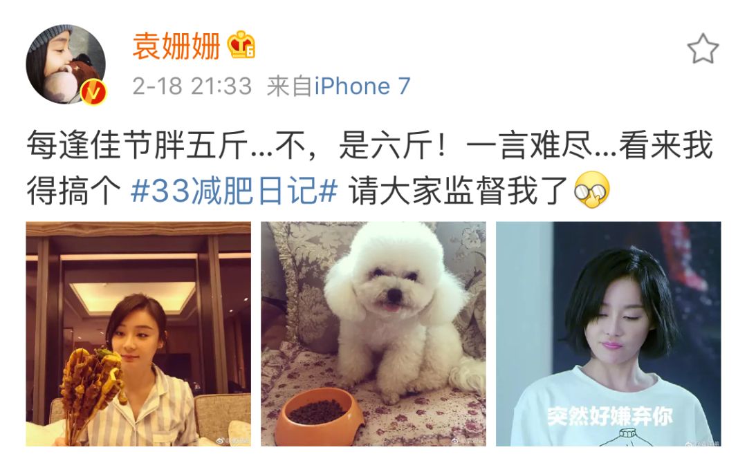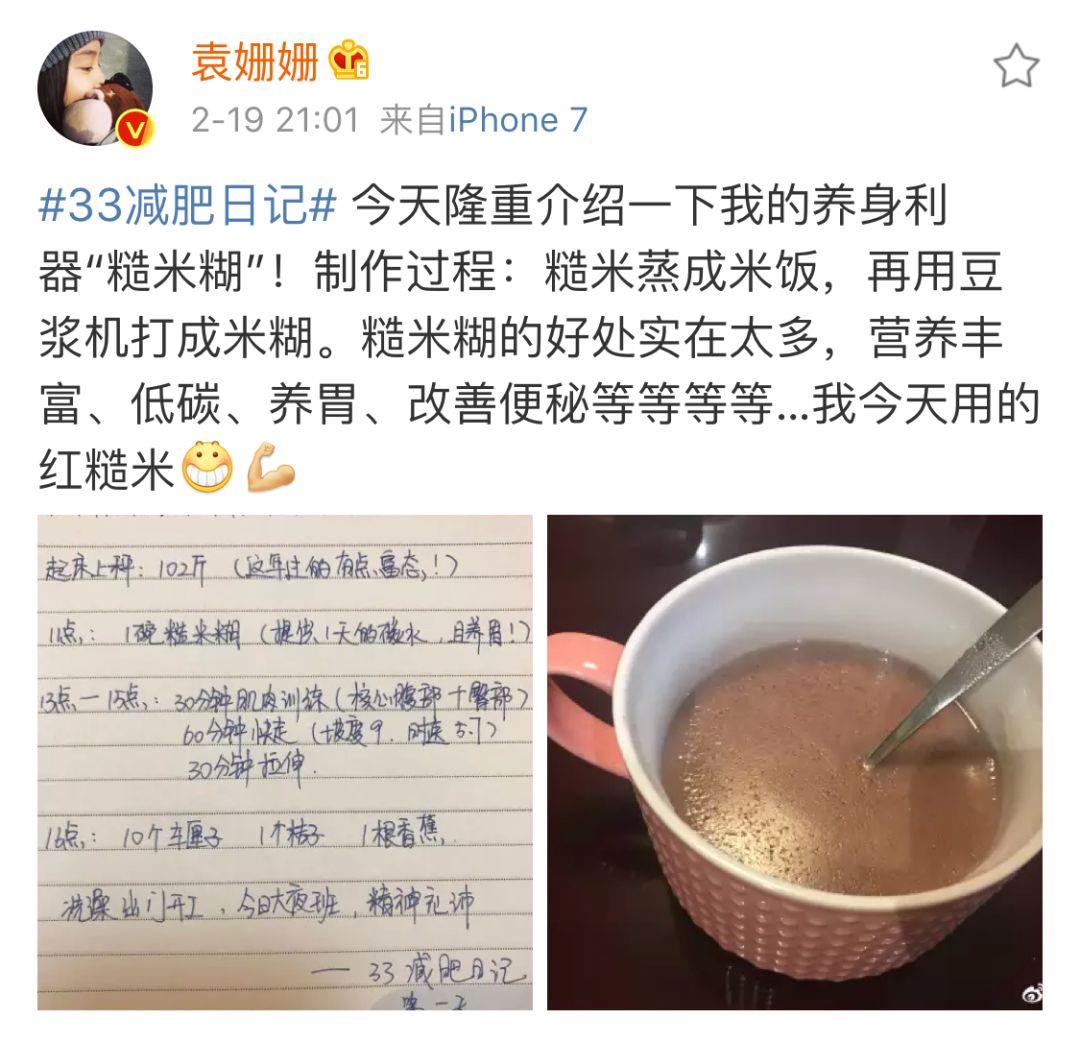 都说每逢佳节胖3斤,明星们也不例外,马甲线女王袁姗姗因为过年胖了6斤,所以直接在微博上搞了个#33减肥日记# ,po自己日常食谱,让大家监督她减肥。