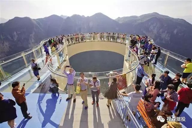 一个巨大的“几”字形玻璃廊桥,如一朵盛开的“空中之花”,挂在海拔1106米的绝壁之巅,悬挑支出长度26.68米,游人踏上桥面,身旁空无一物,脚底万丈悬崖,顿感身如悬浮,似漫步云端天际之间,步步惊心……全景透视脚下的喀斯特地质景观与悬崖绝壁之间的绿树丛荫,独特的视觉画卷尽收眼底。