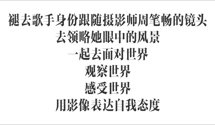 回顾与思考,这也是笔笔出道 13 年以来一直保持初心的原因,坚持自己内心的想法。当然面对大环境的改变她也会做出相应的调整,她在外界中找寻自己内心的声音,从音乐、从影像、从旅行……每收获一点就把它们珍藏起来,成为支撑自己走下去的能力动力。周笔畅似乎从来没有给人很着急的感觉,她说自己是个「慢热型」的人,一切随遇而安,看起来是个「佛系偶像」,面对机遇也不退却,坚定的把握住,如同快门抓取影像时一样,迅速而敏锐,不错过一丝闪光点。强大的能力与感悟力使得笔笔能够从容的面对一切,并让自己每一步都走得稳实且精彩。