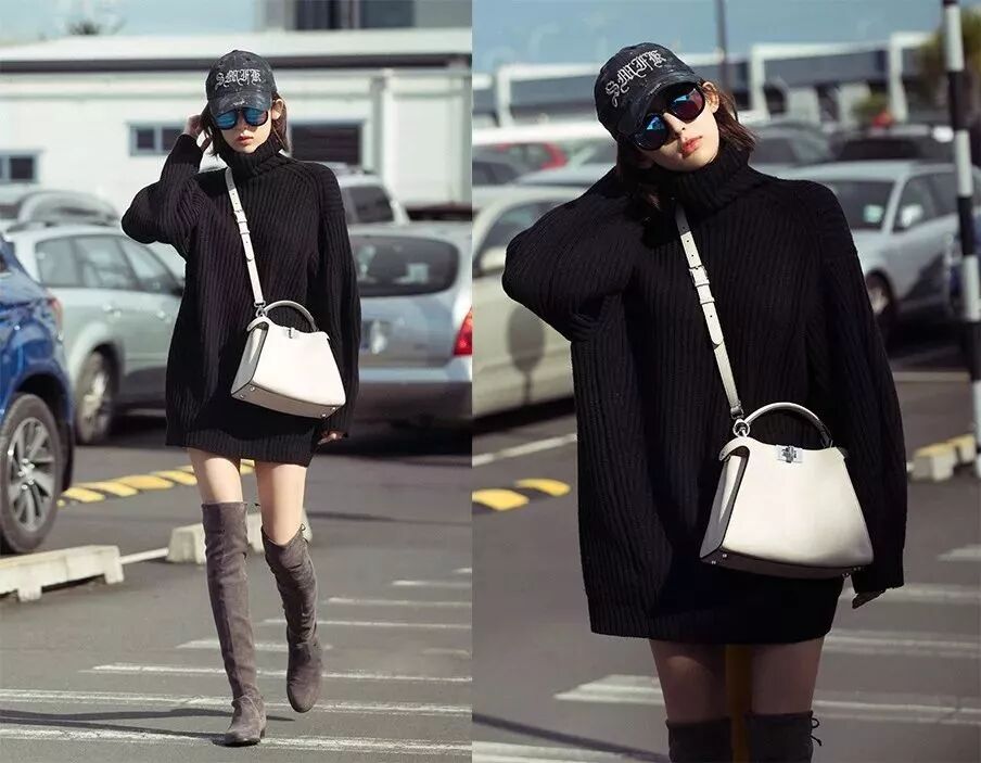 今年长筒靴的风头正盛,很多潮人都穿上了长款毛衣裙搭配它。这样的 Look 更多了一丝性感妖娆。