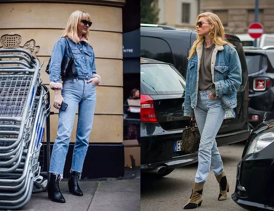 搭配时可以选择与上衣颜色相近的牛仔裤来搭配,复古有味道,配上一双高跟短靴很 Chic。