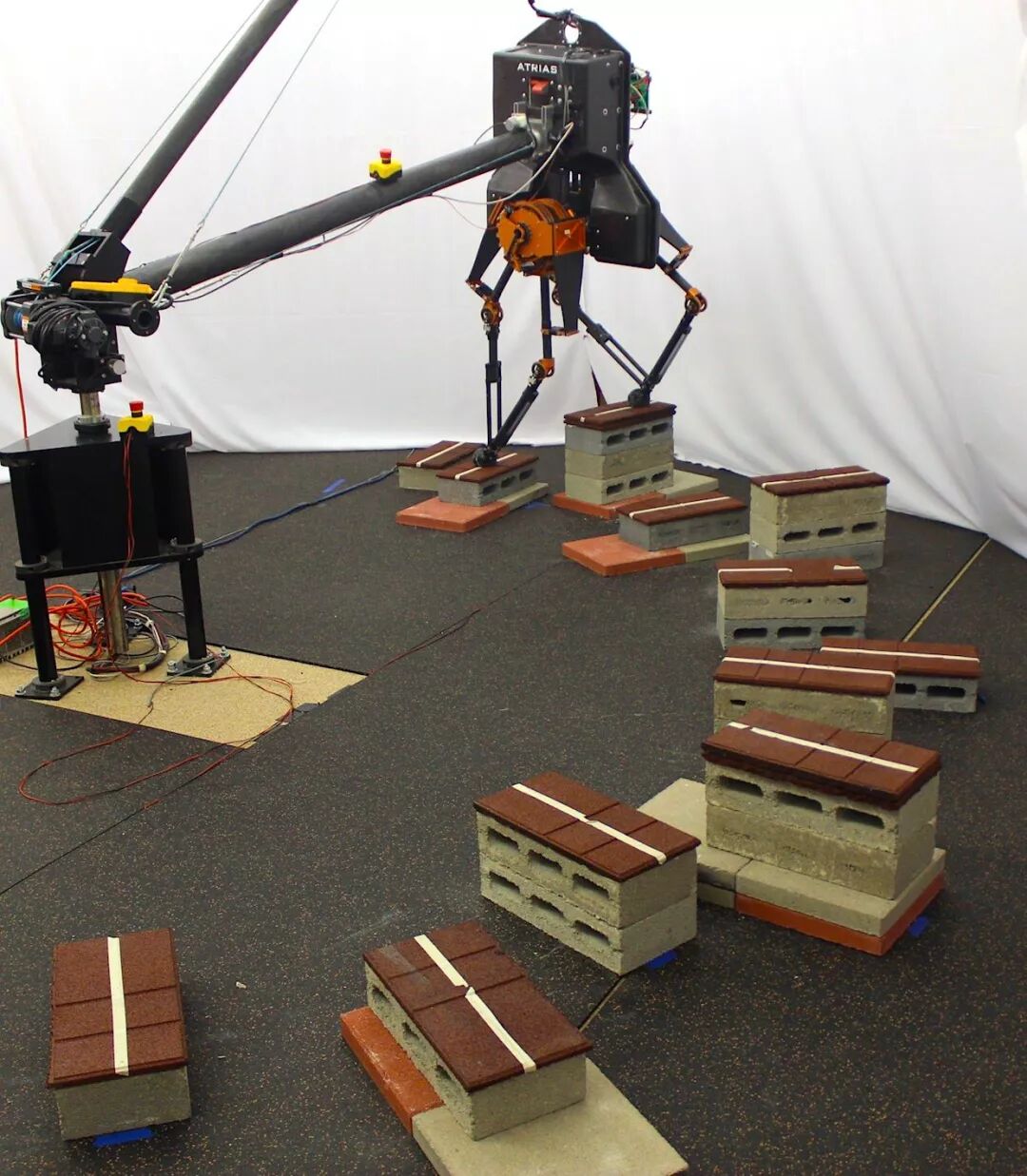 团队通过ATRIAS双足机器人平台上对控制算法进行了实验测试,它能够在随机变化的离散地形上实现动态步行,步长在30到65厘米之间变化,步高需要向上/向下22厘米,同时保持0.6米/秒的平均步行速度。