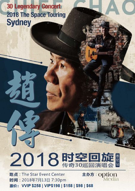 由择富传媒主办的赵传2018《时空回旋》传奇30巡回演唱会悉尼站将在将在2018年7月13日在星港城举行。门票在各大售票点已经全面开售。