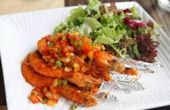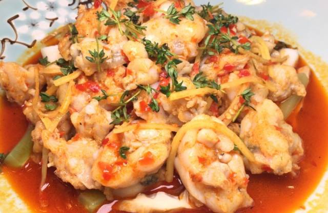 宫保水晶虾球,茄汁酸甜味,虾仁的个头大,饱满有弹性,配菜是花生米和京葱,总体口味鲜甜可口 。